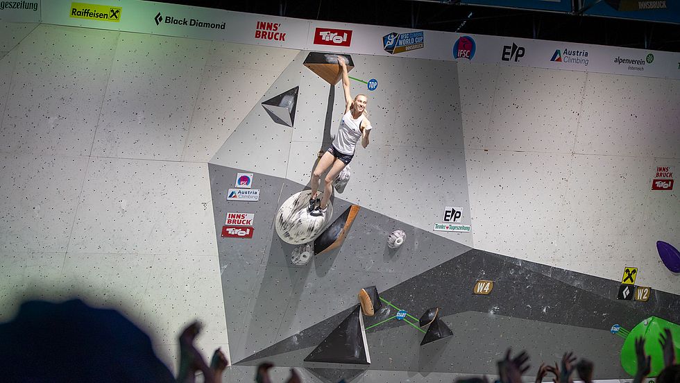 Für die zweifache Kletter-Weltmeisterin war es die erste Finalteilnahme im Bouldern in Innsbruck, Platz fünf ist ihr bestes Weltcup-Ergebnis in dieser Disziplin seit mehr als zwei Jahren (Vierte in Salt Lake City 2022). „Es war richtig cool, vor vollem Haus zu klettern, im Bouldern war das Finale gar nicht unbedingt das Ziel. Ich bin insgesamt sehr positiv überrascht.“